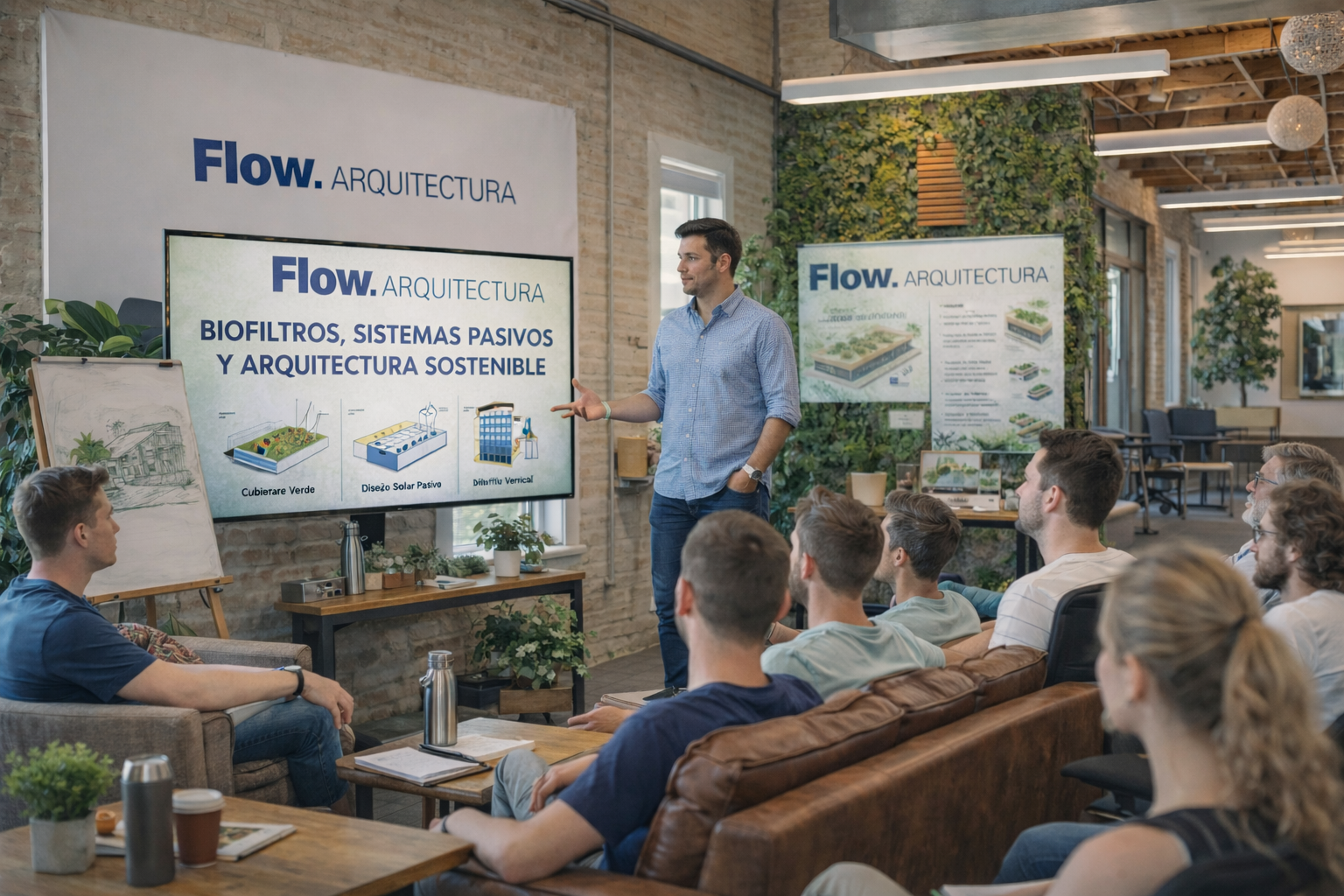 En Flow Arquitectura desarrollamos y divulgamos soluciones basadas en sistemas pasivos, biofiltros y arquitectura sostenible, siempre con un enfoque técnico y viable. Acompañamos a clientes, equipos y administraciones en la toma de decisiones, desde el análisis inicial hasta la materialización del proyecto.